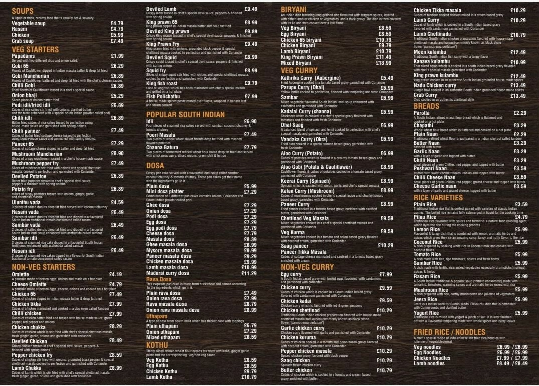“ First visit today, won't be the last. Really nice quality, friendly, attentive service, and excellent pricing for Leamington town centre. We had a few curries, a masala dosa, and rice. Nicest dosa I've ever had, crisp and flavourful. The curries weren't your typical British curry house options, but the menu'e worth exploring. The kothu was very popular at our table. ”